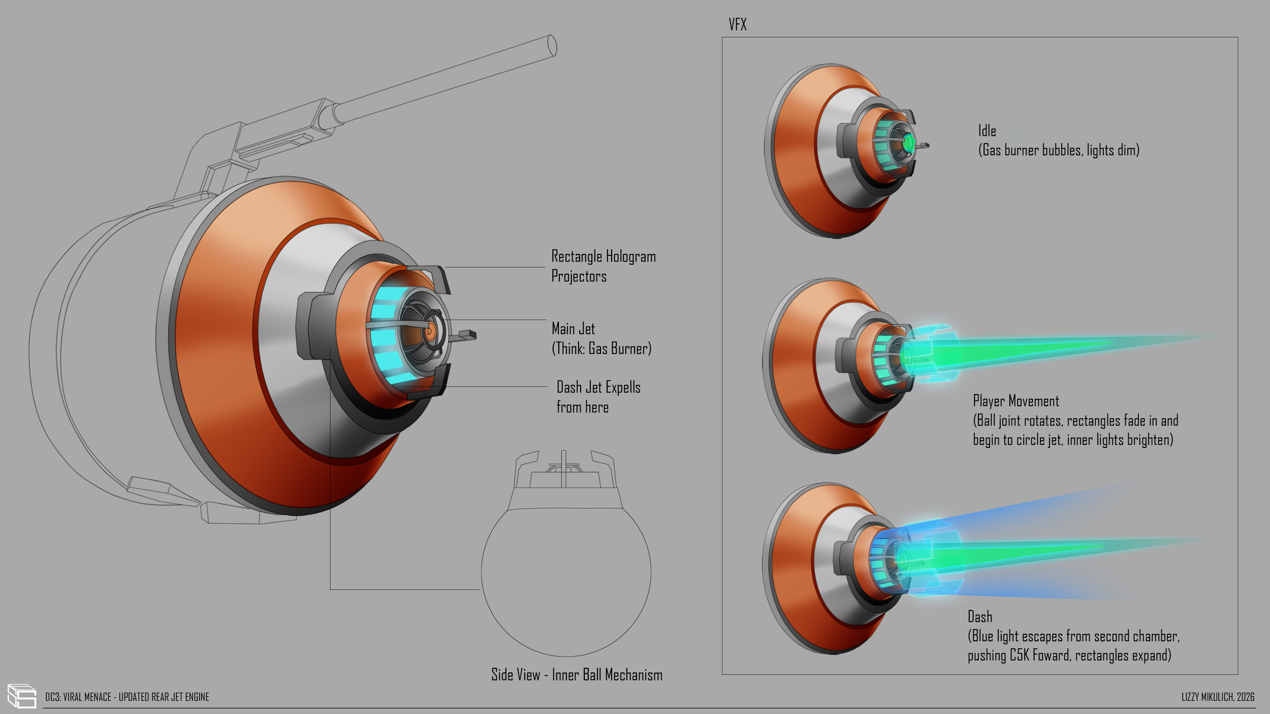 A further breakdown of the models main jet and VFX descriptions. Inspired by a combination of gas burners and jacuzzi tub jets.