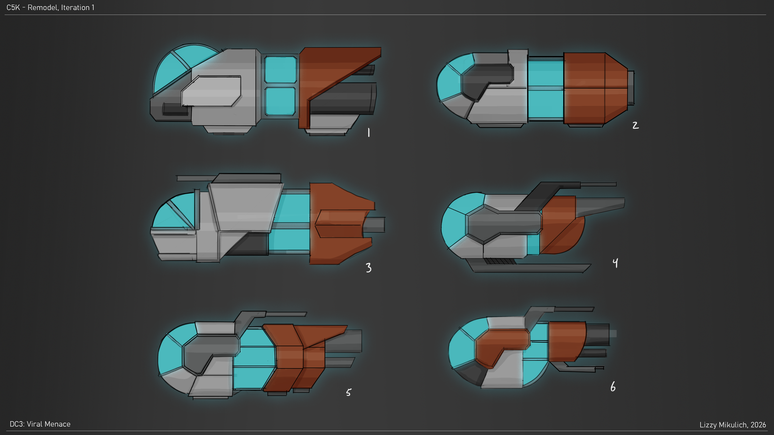 Final iteration of main player model shape design - inspired by a classic “pill” design, mixed with sci-fi elements, allowing for space for main player weapons to be developed and later concepted